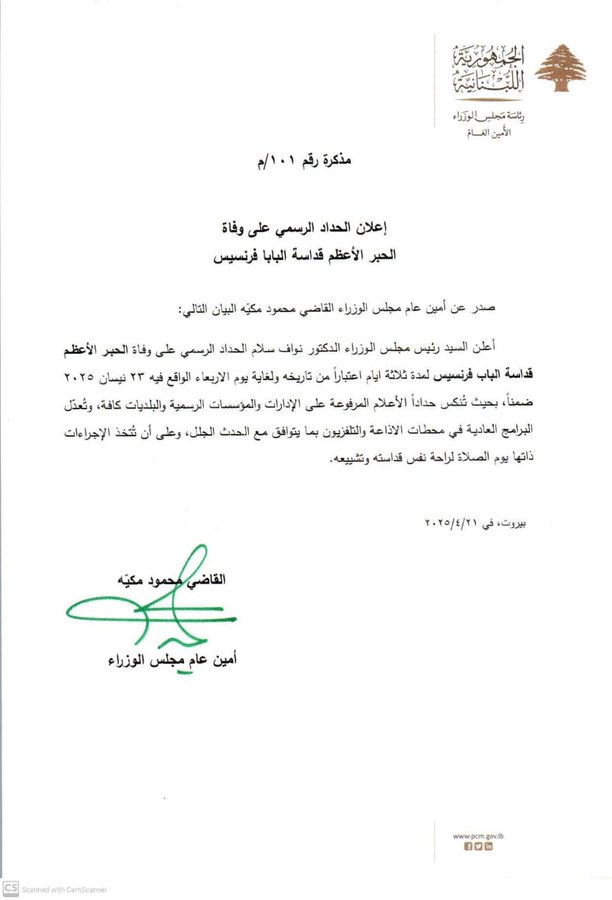 أعلنت رئاسة مجلس الوزراء الحداد على وفاة البابا فرنسيس لمدة 3 أيام اعتباراً من تاريخه ولغاية الأربعاء الواقع فيه 23 نيسان 2025، بحيث تُنكس حداداً الأعلام المرفوعة على الإدارات والمؤسسات الرسمية، وتعدّل البرامج العادية في محطات الإذاعة والتلفزيون بما يتوافق مع الحدث الجلل، على أن تتخذ الإجراءات ذاتها يوم الصلاة لراحة نفس البابا فرنسيس.