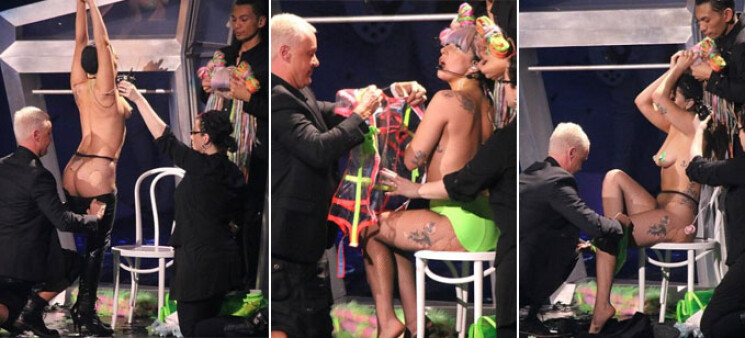 ولم تكتف غاغا بهذا الأمر لجذب الأنظار إليها، فخلال وصلتها الغنائية خلعت ملابسها وتعرّت على المسرح ثم بدلّت ثيابها أمام المئات.