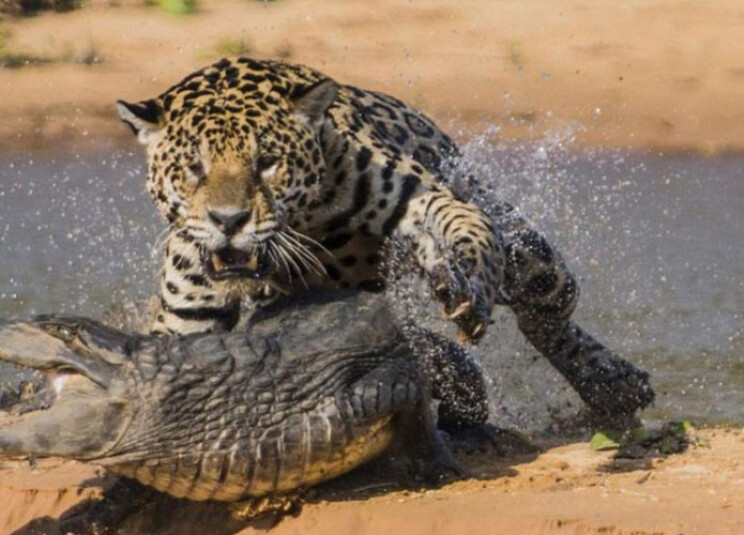 غالباً ما يقدم عالم الحيوان مشاهد رهيبة لصراع القوى بين الحيوانات. ولعل من أفظع تلك المشاهد عندما يتحول الصياد إلى فريسة. هذا ما حدث لتمساح وهو متسلق على أحد ضفاف البرازيل، حيث تسلل إليه فهد أميركي جاغواربطريقة ماكرة ليداهمه وينقض عليه بسرعة فائقة لم تدع للتمساح مجالاً للهروب أو الدفاع عن نفسه.