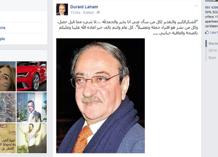 كذَّب النجم العربي، دريد لحام، نبأ وفاته في دمشق، الذي انتشر بشكل واسع عبر وسائل الإعلام ومواقع التواصل الاجتماعي، حيث أكد عبر صفحته على موقع الفايسبوك، أنه بخير وبصحة جيدة.