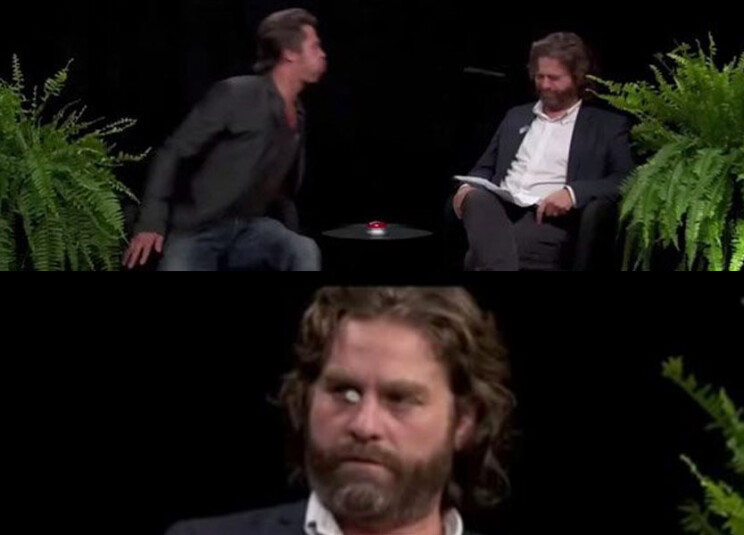 وعندما سأل Zach، براد بيت، كيف قابل أنجيلينا للمرة الأولى، وهل كان لقاءهما الأول رومانسيا، مثل لقاء شخصية "روس" و"رايتشل" من مسلسل "فريندز"، حيث كانت تقوم جينفر أنيستون، زوجة براد بيت السابقة، بدور رايتشل في المسلسل الشهير، فقام براد بيت ببصق العلكة من فمه في وجه Galifianakis، ثم نظر إلى الكاميرا وقال: "السؤال التالي؟".