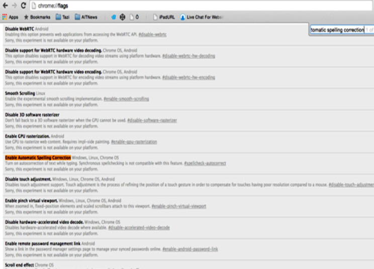 ويمكن لمستخدمي غوغل كروم تفعيل هذه الميزة من خلال كتابة chrome://flags/ في شريط العنوان ثم الضغط على زر إنتر في لوحة المفاتيح والبحث عن enable automatic spelling correction وأخيراً الضغط على زر Enable.
