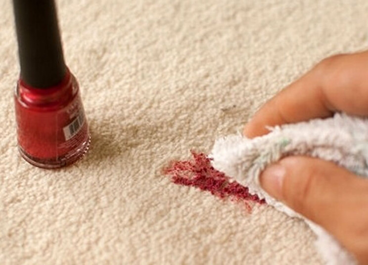 يجب أوّلاً التنبّه إلى لون السجادة. فإذا كان أبيض أو فاتحاً، استخدمي مزيل الطلاء الخالي من مادّة الأسيتون. أمّا إذا كان لون السجاد غامقاً، استعملي مثبّت الشعر أو بعض السبيرتو وامسحي البقعة بإسفنجة أو ورقة.