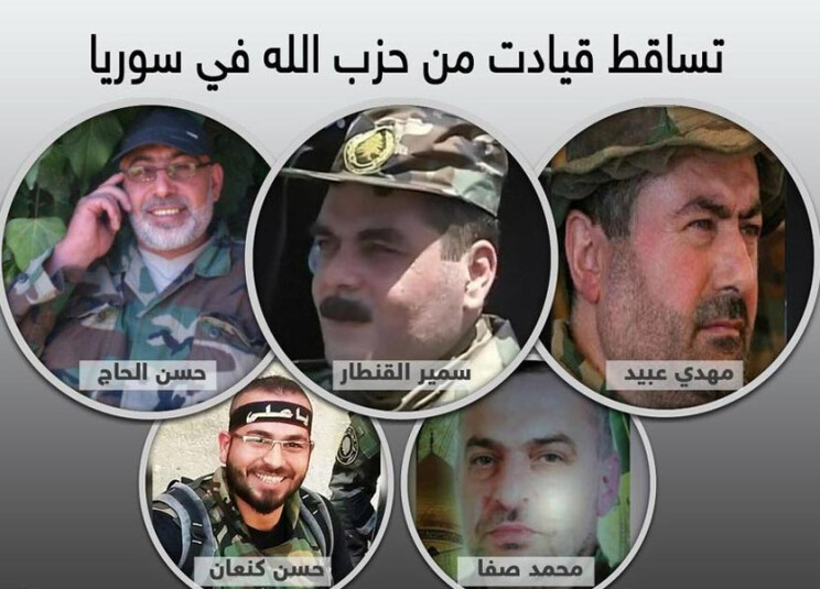 - سمير القنطار: هو آخر القتلى من كبار قيادات حزب الله في سوريا، ونعاه الحزب وحمّل إسرائيل مسؤولية مقتله بقصف جوي، بينما اعلنت دمشق إنه قضى بتفجير المبنى الذي يقيم فيه، وأن مسلحين استهدفوه.