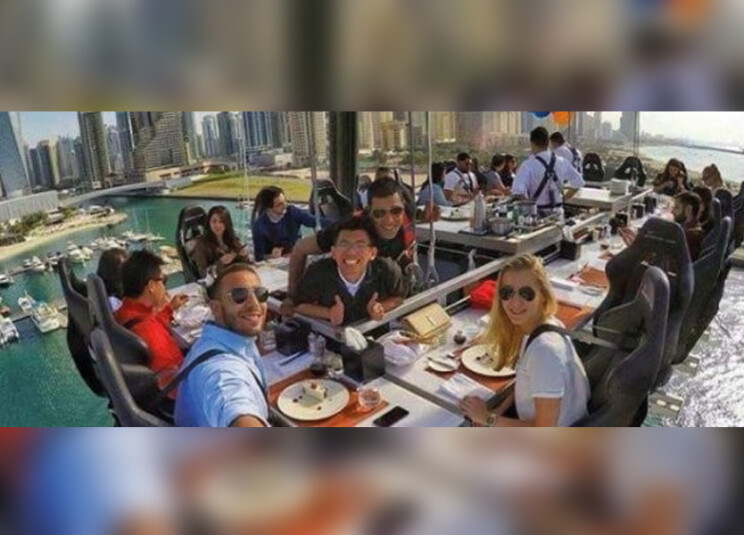 أحد المعالم الجديدة تُضاف إلى المعالم الكثيرة في دبي بالإمارات. هذه المرة، المعلم هو عبارة عن مطعم مُعَلَّق على ارتفاع 50 متراً في السماء يتيح لرواده الاستمتاع بتناول الحلوى والشطائر والمشروبات وهم بين السماء والأرض.
