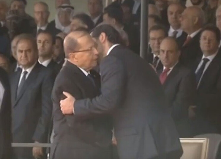 صافح رئيس الجمهورية العماد ميشال عون وقبّل الرئيس سعد الحريري قبيل بدء العرض العسكري لمناسبة الذكرى 74 للإستقلال.