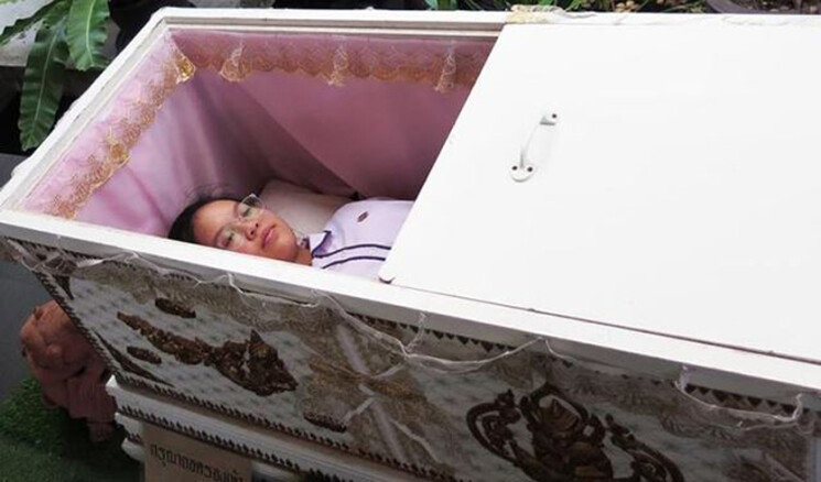 اخلع حذائك، وتسلق إلى تابوت بوذي، واسترخي على ظهرك مع غطاء خشبي فوقك، وابقى في الداخل لمدة ثلاث دقائق في الظلام.. هذا هو مقهى بانكوك للموت، حيث يمكن للزبائن تناول القهوة والاستلقاء في تابوت.
