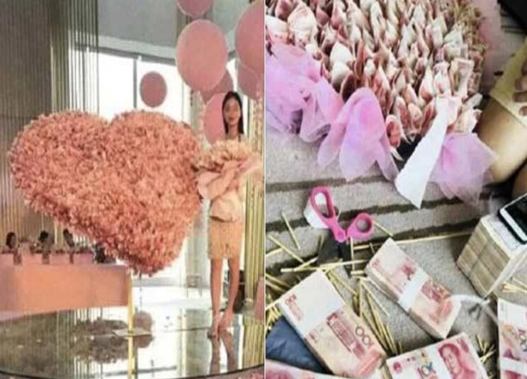 فتظهر صور متداولة بشكل كبير عبر مواقع التواصل الإجتماعي سيّدة صينية لم يكشف عن اسمها تقف إلى جانب هديتها المكلفة وهي عبارة عن باقة من النقود على شكل قلب كبير في غرفة فندق فاخرة في منطقة "تشونغتشينغ".