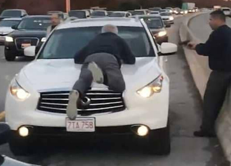 وفي بيان، قالت الشرطة إن سيارة إنفنيتي كانت تسير بسرعة 112 كيلومتر في الساعة ثم تتوقف، ثم تعود وتتسارع، لكن الرجل لم يترجل عن غطاء المحرك.