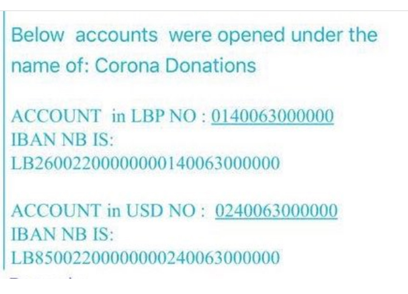 أطلق وزير الصحة العامة الدكتور حمد حسن الصندوق الوطني لمكافحة كورونا، وأعلن فتح الحساب الآتي للتبرع لمواجهة الفيروس.