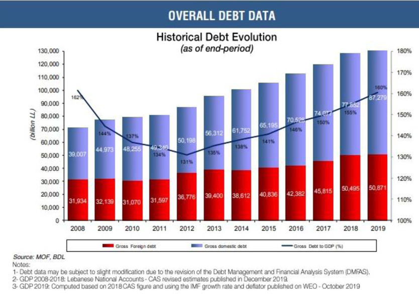 وعلى الرغم من أنّ دراسة استدامة الدين العام ترتكز عموماً على مؤشر الدين العام/ الناتج الحلي، وهو يتخطّى في لبنان عتبة 160 %، فيما وفق المعايير الدولية، تتطلّب استدامة الدين ألّا يتخطّى هذا المعدل 60 % الى 80 % من الناتج المحلي الإجمالي. إلّا أن تسليط الضوء، خصوصاً على الدين بالعملة الأجنبية، فهو يعود لأن لبنان قادر نظرياً في أقسى الحالات اللجوء الى المصرف المركزي لطباعة العملة الوطنية وتسديد الدين بالليرة اللبنانية، حتى لو أدّى ذلك الى مزيد من التضخّم. إلّا أنّ الأزمة الكبرى تبقى في الدين بالعملة الأجنبية، التي تحتاج الى توافر العملة الأجنبية وتأمين استمرارية إستقطابها، في حين أنّ لبنان يشهد تدهوراً في ميزان المدفوعات (ما عدا كمية الدولارات التي اجتذبتها المصارف للمشاركة في الهندسات المالية خصوصاً عام 2016 لشراء اليوروبوند وشهادات إيداع المصرف المركزي بالعملة الأجنبية ).