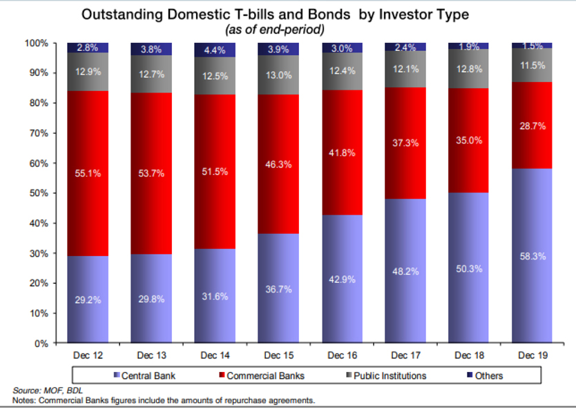 ويبقى أكثر مما يوازي 55 مليار دولار من «الدين الحكومي» بالليرة اللبنانية على شكل سندات خزينة، اذا اعتمدنا مجموع الـ85 مليار دولار دين عام 2019، لأنّ «الدين العام» يفترض أن يشمل كل ديون المؤسسات العامة والفواتير غير المدفوعة للضمان الاجتماعي والمستشفيات العامة والمقاولين...