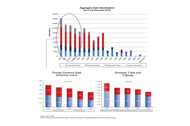في العام 2020 وحده ، كان على لبنان سداد 4.7 مليارات دولار على شكل كوبونات وسندات يوروبوند الرئيسية. «بدأنا بسداد القسائم لشهري تشرين الاول وت 2 ، والتي تمثل حوالى 100 مليون دولار. لن يتمّ سداد المبلغ المتبقي 4.58 مليارات دولار حتى يتمّ التوصل إلى اتفاق. ومن المتوقع أن يسدّد لبنان ما يعادل 10.3 مليارات دولار من سندات الخزينة في عام 2020.