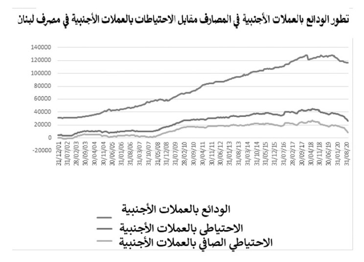 منذ ارتفاع معدل الدولرة إلى 86% في أعقاب التضخم الجامح عام 1987، صمدت الدولرة في لبنان وانخفضت فقط إلى أقل من 70% بقليل، لترتفع إلى أكثر من 76% اليوم. حتى اندلاع الأزمة في عام 2019، كانت الودائع بالدولار قد بلغت نحو 120 مليار دولار، أي مرة ونصف من الناتج المحلي الإجمالي للبنان في ذلك الوقت، واحتفظ القطاع المصرفي بيوروبوند بقيمة 15 مليار دولار، كما احتفظ بـ70 مليار دولار لدى مصرف لبنان على شكل احتياطات الزامية على الودائع بالعملات الأجنبية (15% من الودائع بالعملات الأجنبية أو ما يقرب من 18 مليار دولار) وشهادات إيداع بالدولار (تقدّرها بلومبيرغ بـ 52.8 مليار دولار)... بينما مصرف لبنان حمل سندات دولية مقابل 5.7 مليارات دولار.