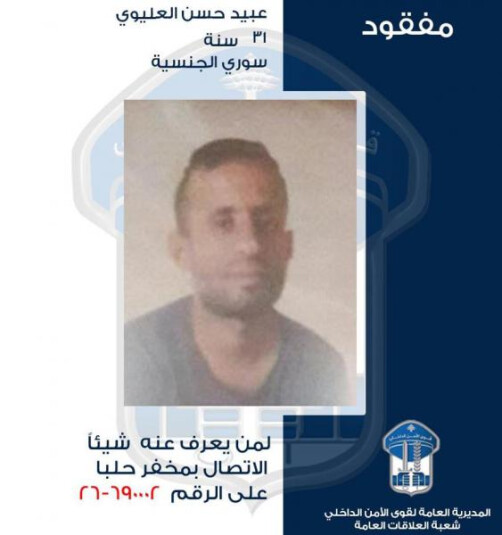 عممت المديريّة العامّة لقوى الأمن الدّاخلي، بناءً على إشارة القضاء المختص، صورة المفقود: عبيد حسن العليوي (من مواليد عام 1990، سوري) الذي خرج من منزله الكائن في محلّة "مفرق منيارة"، بتاريخ 6-12-2021 الى جهةٍ مجهولة ولم يعد حتى تاريخه.