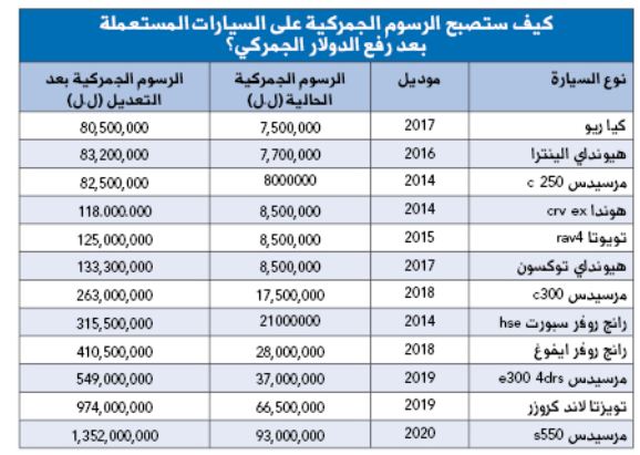 أكثر السلع او القطاعات تضرّراً من رفع الدولار الجمركي هي السيارات المستوردة، التي سترتفع قيمة رسومها الجمركية حوالى 20 ضعفاً، في حال احتُسب الدولار الجمركي على سعر صرف الـ20 الف ليرة كما تمّ التداول به. علماً انّ الرسوم الجمركية على السيارات المستعملة المستوردة الى لبنان تشكّل 50 في المئة من قيمتها، وهي تدرّ إيرادات لخزينة الدولة تقدّر بحوالى 10 ملايين دولار يومياً، مع احتساب قطاع قطع غيار السيارات، و3 مليارات ليرة يومياً لصالح مصلحة تسجيل السيارات.