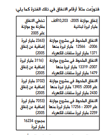 وبذلك يتجاوز مجموع الانفاق المحقّق من الموازنة والخزينة بين 2006 و2009 حدود انفاق موازنة 2005 مضروبا بأربعة (وفق القاعدة الاثني عشرية) بمبلغ 16234 مليار ليرة، أو ما كان يعادل حينها 10.8 أي تقريبا 11 مليار دولار (وفق سعر صرف 1500 ليرة للدولار الواحد) الذي دار سجال كبير حوله.