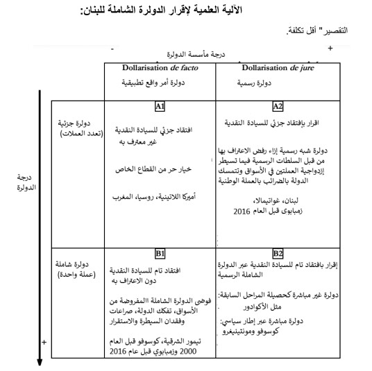 بغية تفادي فوضى الدولرة الشاملة كأمر واقع، كما حصل في تيمور الشرقية وكوسوفو قبل عام 2000 وزيمبابوي قبل عام 2016، بما يحمل ذلك من مخاطر تفتيت الدولة والفوضى الشاملة غير القابلة للانضباط، في ظل عجز تمويل المؤسسات العامة التي تحسب موازناتها بالليرة وتسدّد نفقاتها بالدولار..