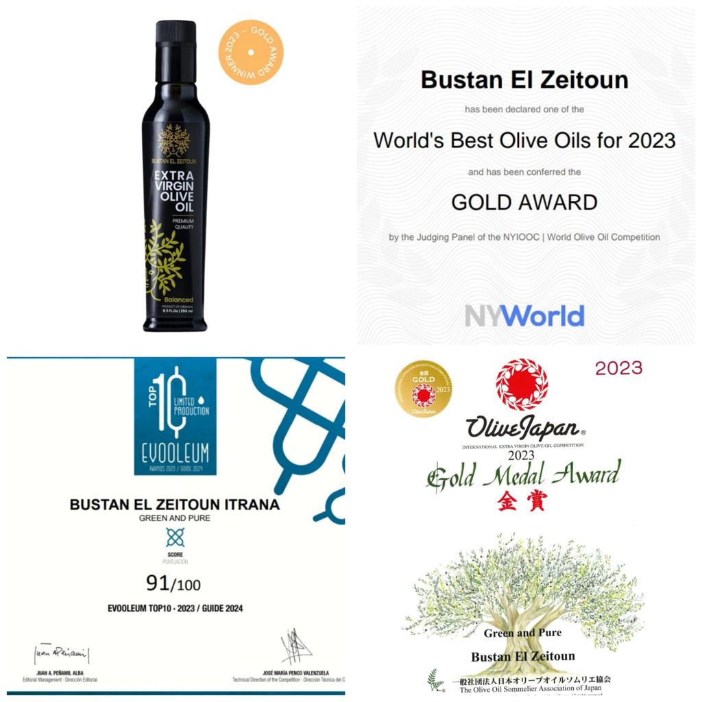 فمن بلدة عبرا الجنوبية (قضاء صيدا)، تمكّن "بستان الزيتون" من تجسيد مقولة "فخر الصناعة الوطنية"، بثلاث جوائز ذهبية لسنة ٢٠٢٣ في كلّ من مسابقة NYIOOC العالمية لجودة زيت الزيتون، التي تُقام في ولاية نيويورك الأميركية، وفي مسابقة EVOOLEUM لأفضل مائة زيت زيتون بكر ممتاز حول العالم والمنظّمة في قرطبة إسبانيا، إلى جانب OLIVE JAPAN المسابقة الدولية لزيت الزيتون البكر في اليابان.