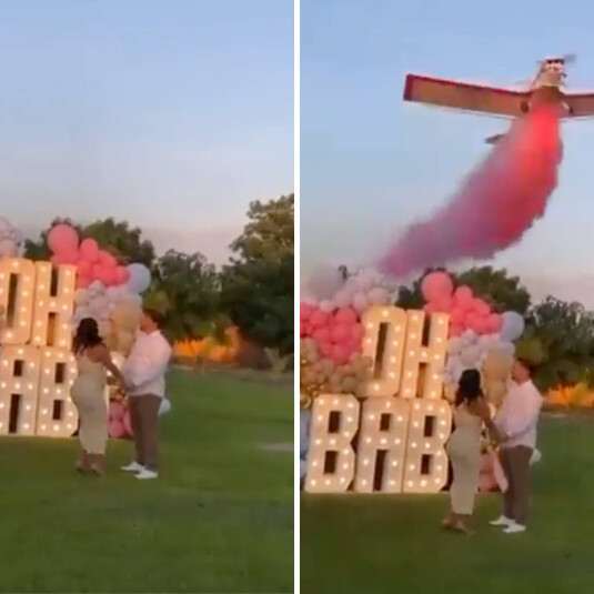 ويظهر الزوجان السعيدان في مقطع فيديو متداول، أمام لافتة عملاقة مضاءة كتب عليها "Oh Baby"، بينما يحيط بهما الأصدقاء والعائلة.