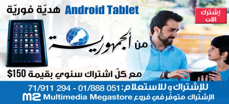 من صحيفة "الجمهورية" Android Tablet هدية فورية مع كل اشتراك سنوي بـ150$...للاشتراك 01/888051-71/911294