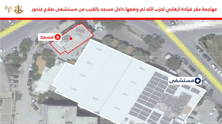 وذكر الجيش في بيان: "خلال الليل، وبتوجيه من استخبارات الجيش الإسرائيلي، قصفت القوات الجوية مقاتلين من حزب الله كانوا ينشطون داخل مركز قيادة يقع داخل مسجد مجاور لمستشفى صلاح غندور في جنوب لبنان".