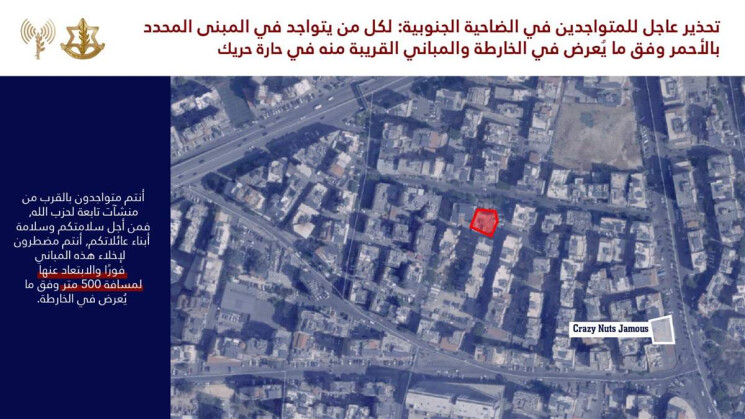 وجه الجيش الاسرائيلي تهديدا جديدا لسكان مبان في الحدث وحارة حريك بوجوب اخلائها.