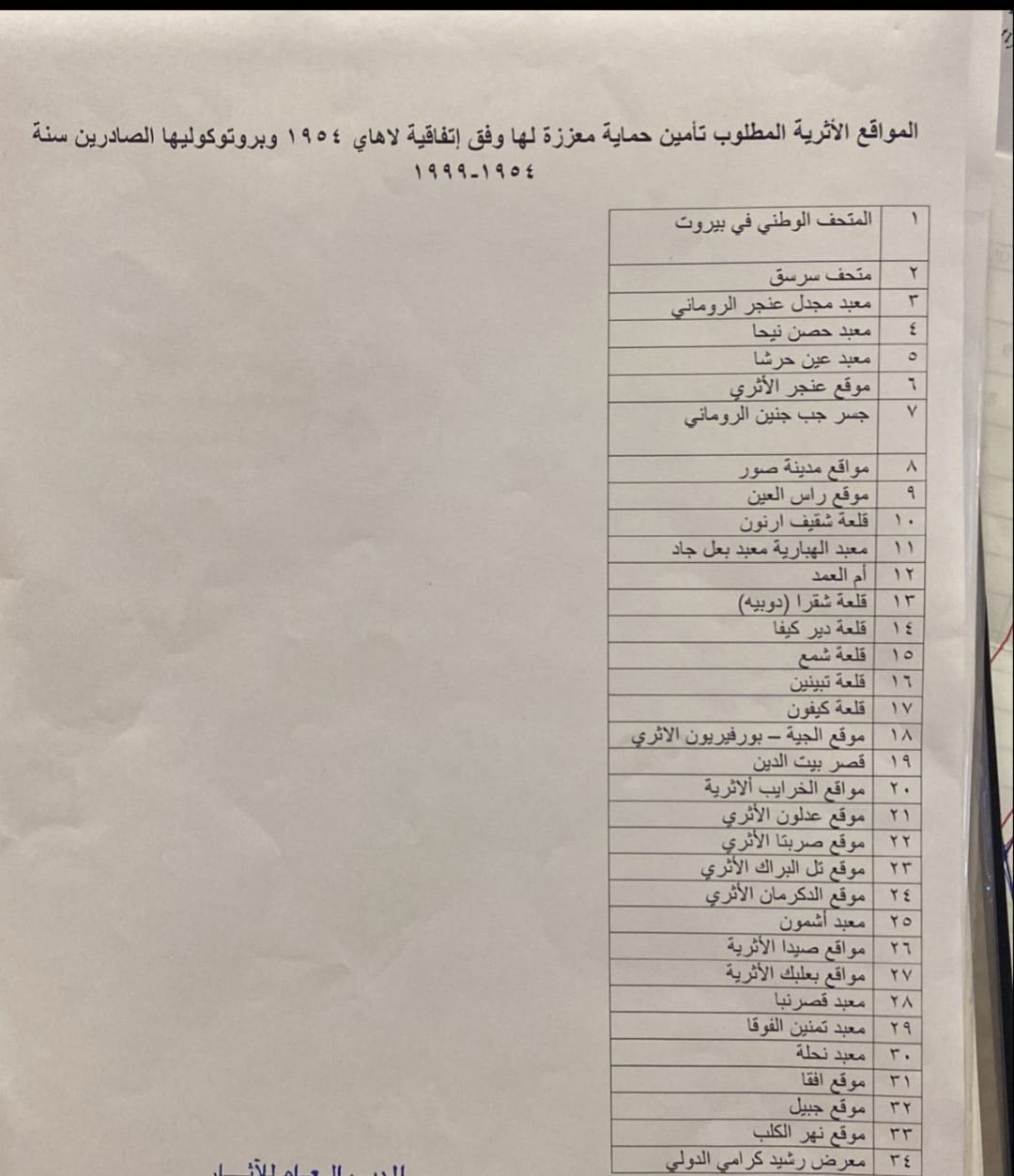 صدر عن وزير الثقافة في حكومة تصريف الاعمال القاضي محمد وسام المرتضى البيان الآتي: "قبل لحظات قرّرت منظّمة اليونسكو منح الحماية المعزّزة ضدّ العدوان الإسرائيلي لأربعة وثلاثين موقعًا أثريًّا لبنانيًّا بناءً على طلب وزارة الثقافة.