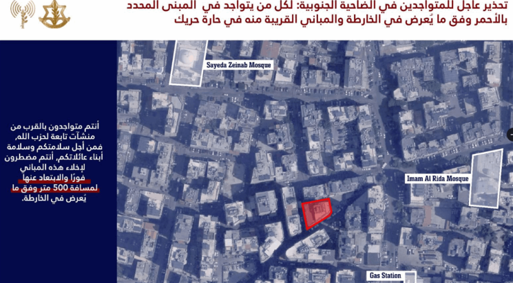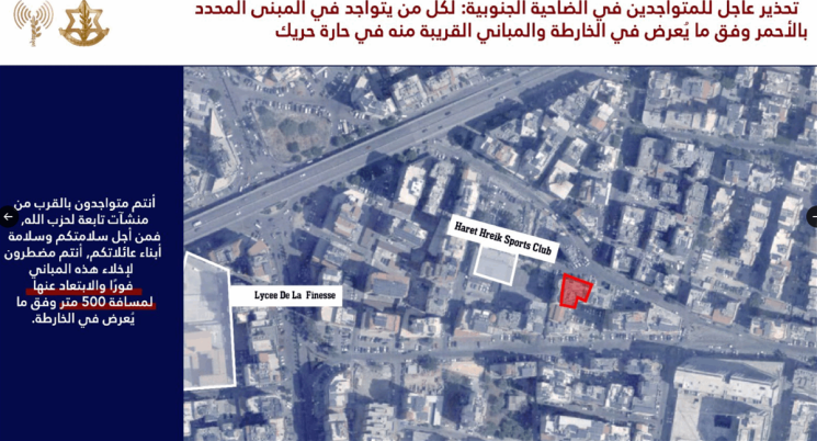 حذّر المتحدث باسم الجيش الاسرائيلي باللغة العربية افيخاي أدرعي السكان المتواجدين في منطقة الضاحية الجنوبية وتحديدًا في المباني المحددة في الخرائط المرفقة والمباني المجاورة لها في المناطق التالية: حدث بيروت وحارة حريك.