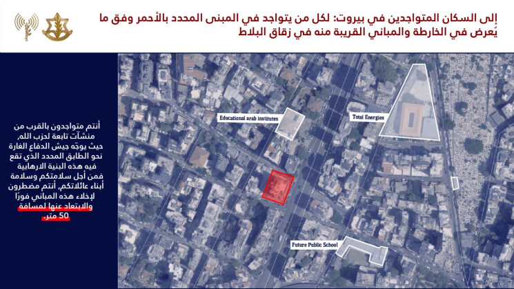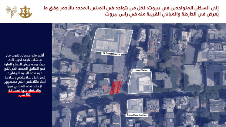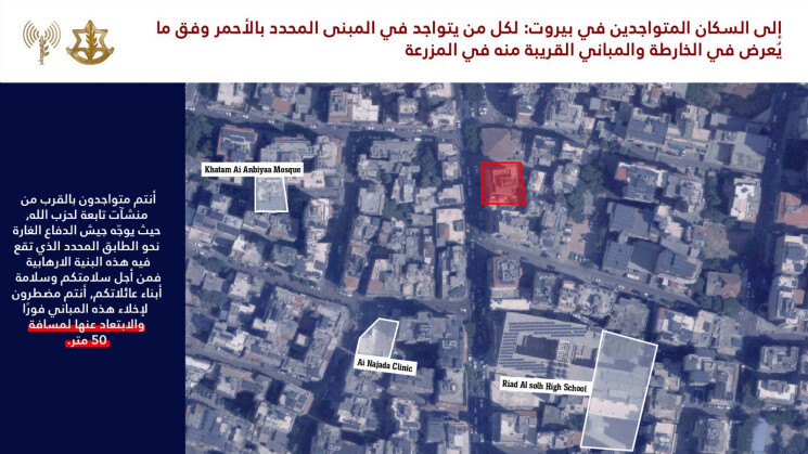 وجه الجيش الإسرائيلي إنذارا الى سكان مبان في راس بيروت والمزرعة والمصيطبة وزقاق البلاط بالاخلاء، قبيل استهدافها.