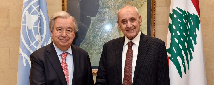 استقبل رئيس مجلس النواب نبيه بري، في مقر الرئاسة الثانية في عين التينة، اليوم، الأمين العام للامم المتحدة أنطونيو غوتيريش والوفد المرافق بحضور المنسّقة الخاصّة للأمم المتحدة في لبنان جينين هينيس بلاسخارت، وكيل الأمين العام للامم المتحدة لعمليات السلام جان بيار لاكروا، قائد القوات الدولية العاملة في جنوب لبنان "اليونيفيل" الجنرال آرولدو لاثارو والمستشار الإعلامي للرئيس بري علي حمدان حيث تناول اللقاء الأوضاع العامة في لبنان والمنطقة والمستجدات السياسية والميدانية على ضوء مواصلة إسرائيل خرقها لبنود وقف إطلاق النار وإحتلالها لإجزاء من الأراضي اللبنانية الجنوبية الحدودية.