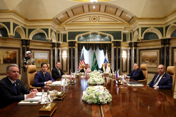 يوم الثلاثاء، اجتمع مسؤولون أميركيّون وروس رفيعو المستوى في الرياض لإجراء محادثات أولية حول إنهاء الحرب في أوكرانيا وإعادة العلاقات إلى طبيعتها، وهو هدف رئيسي آخر من أولويات السياسة الخارجية لترامب. هذه المرّة، قدّمت السعودية صورة مختلفة تماماً، فاستضافت المحادثات على وجبة غداء تضمّنت أطباقاً عربية وغربية، من بينها «سمفونية من الإسكالوب والجمبري والسلمون» وكعكة الكنافة بالجبن، وفق وسائل الإعلام الروسية الرسمية.