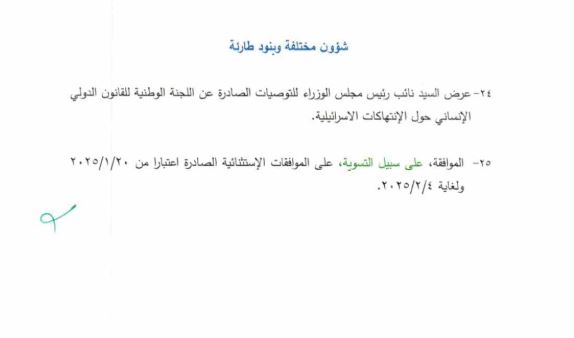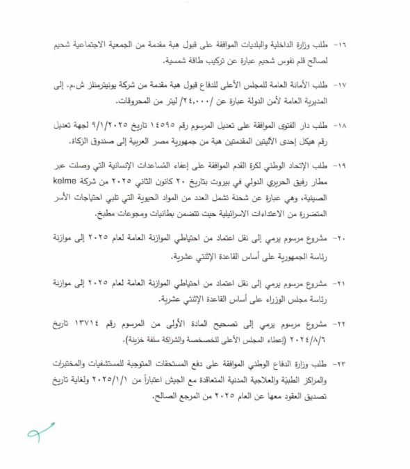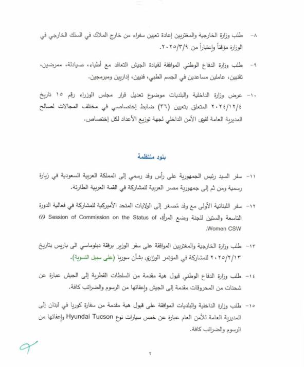 يعقد مجلس الوزراء أول جلسة عملية له في الحادية عشرة قبل ظهر الخميس المقبل في قصر بعبدا، وعلى جدول أعمالها 25 بندًا، أبرزها ما يتعلق بموضوع موازنة 2025 التي أقرتها الحكومة السابقة ورفعتها إلى مجلس النواب الذي لم يناقشها، وأيضًا موضوع تعيين سفراء من خارج الملاك في السلك الخارجي في الوزارة، إضافة إلى أمور تنظيمية منها رحلات سفر إلى الخارج.