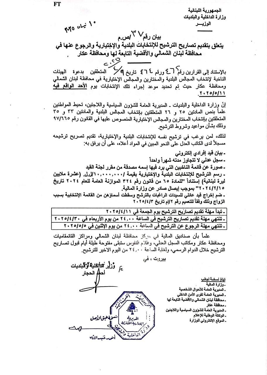 نشرت وزارة الداخلية والبلديات، على منصة "أكس"، بيانا صادرا عن الوزير أحمد الحجار يتعلق بتقديم تصاريح الترشيح للانتخابات البلدية والاختيارية والرجوع عنها في محافظة لبنان الشمالي والأقضية التابعة لها ومحافظة عكار.