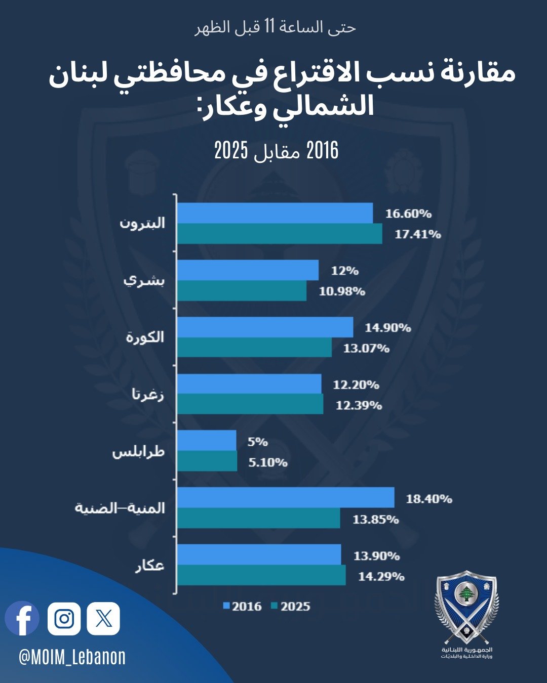 نشرت "وزارة الداخلية" مقارنة في نسب الاقتراع في محافظتي لبنان الشمالي وعكار حتى الساعة 11 قبل الظهر بين عام 2016 وعام 2025.