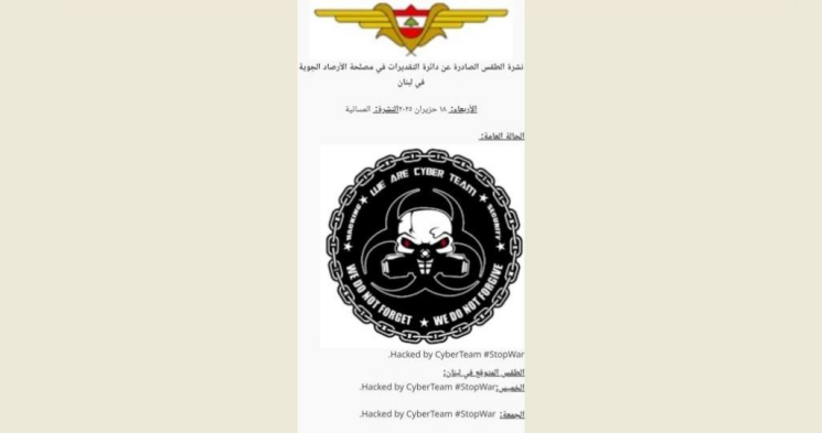 أفادت "الوكالة الوطنية للاعلام" بتعرض موقع مصلحة الأرصاد الجوية الذي يعمم نشرة الطقس لعملية قرصنة من CyberTeam #StopWar . وتعمل الجهات المعنية على حل المشكلة.