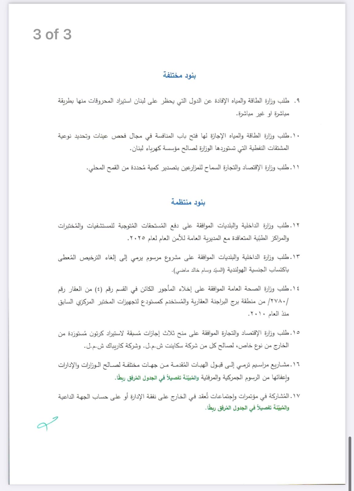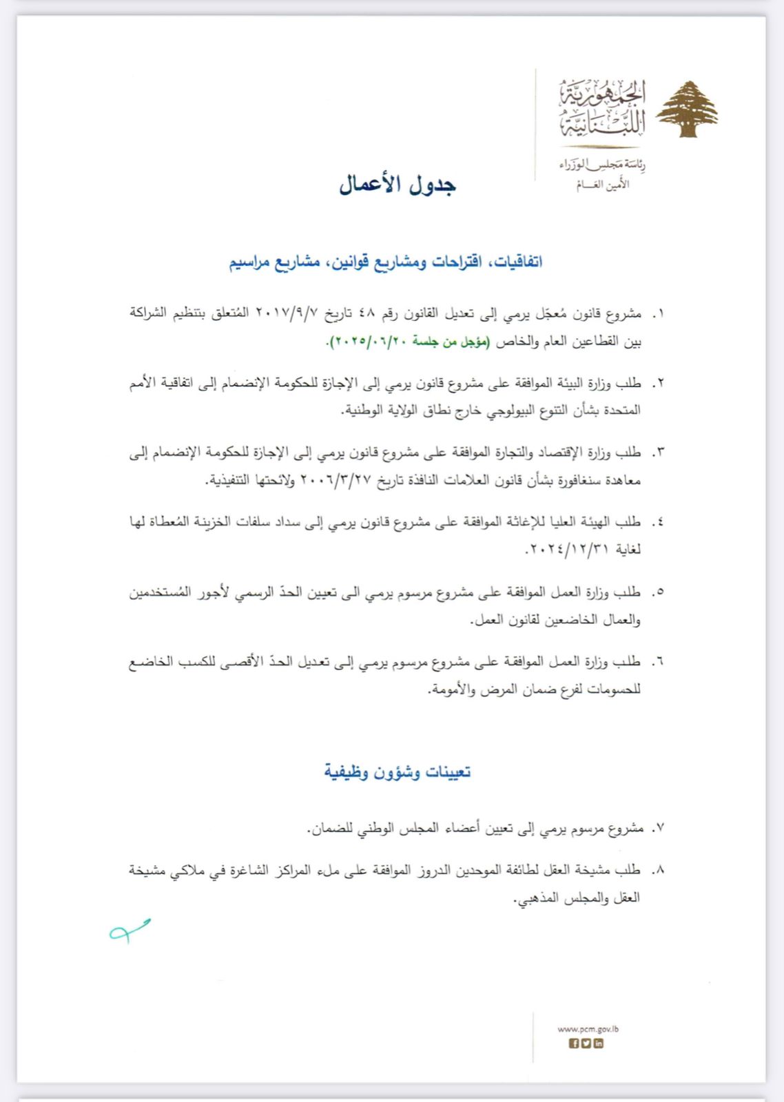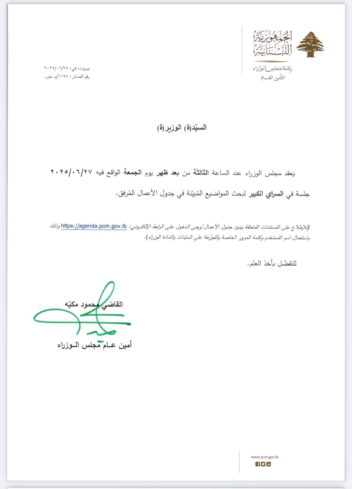 يعقد مجلس الوزراء جلسة عند الساعة الثالثة من بعد ظهر يوم الجمعة الواقع فيه 27/06/2025 جلسة في السراي الكبير لبحث المواضيع المبيّنة في جدول الأعمال المرفق.