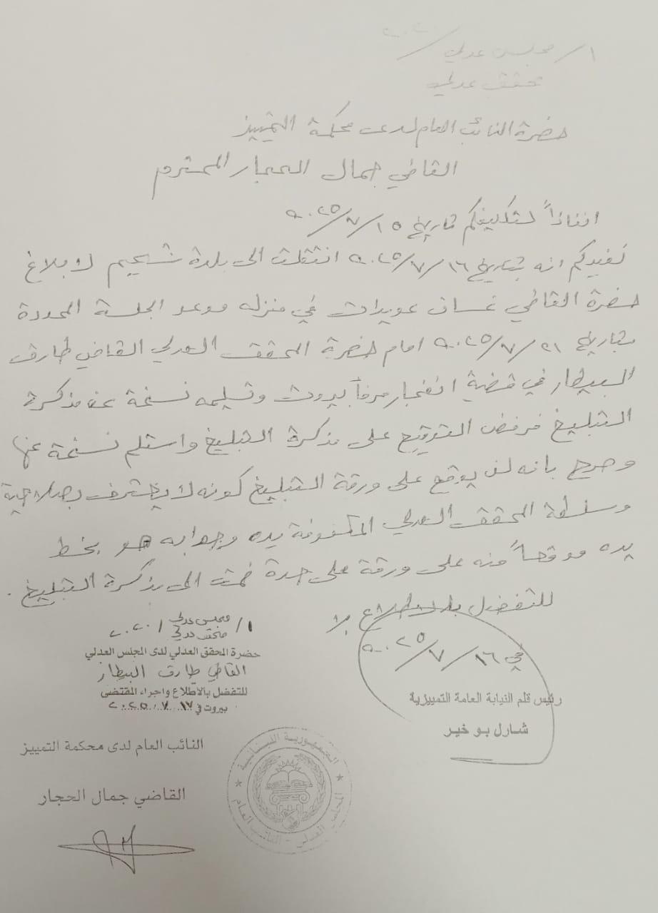 أما أنتم يا حضرة النائب العام لدى محكمة التمييز الذي ارتضيتم تنفيذ هكذا قرارات مجبولة بالخطأ الجسيم مغلوطة ومخالفة للقانون، قرارت ساحبة وسالبة لصلاحياتتكم فإنني أطلب اليكم تصيحي المسار والادعاء عليّ أصولا ومقاضاتي والادعاء على باقي القضاة الذين أجبرتموهم على المثول أمام جهة غير صالحة وذلك عملا بأحكام المواد 344 أ.م.ج وما يليها حرصا على العطالة واحتراما للمركز الذي أنتم عليه مؤتمنون وصونا لدولة القانون التي تنشدون".
