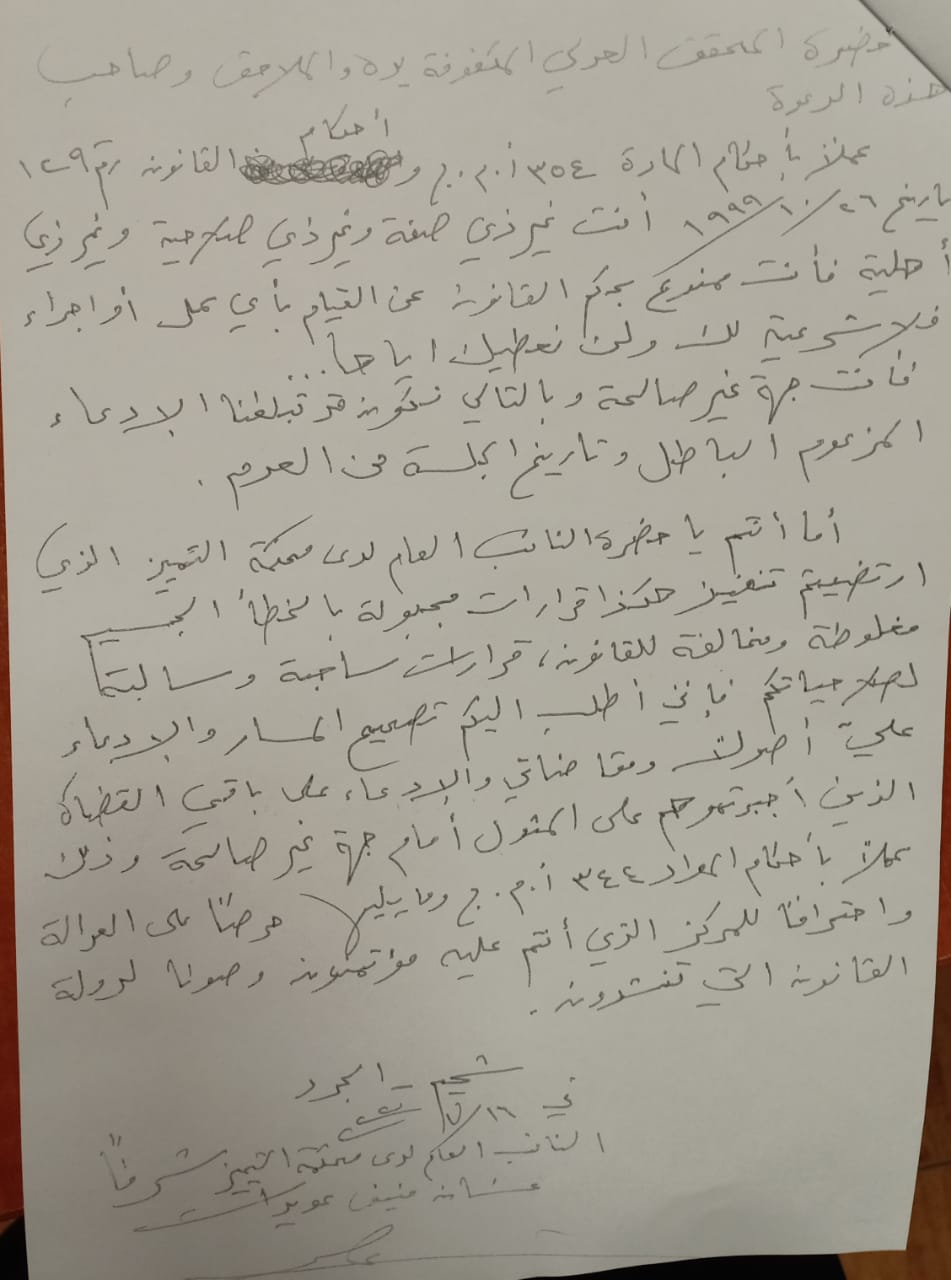 عملا بأحكام المادة 354 أ.م.ج وأحكام القانون رقم 129 تاريخ 26/10/1999 أنت غير ذي صفة وغير ذي صلاحية وغير ذي أهلية فأنت ممنوع بحكم القانون عن القيام بأي عمل أو اجراء فلا شرعية لك ولن نعطيك إياها...