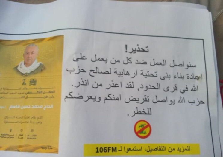 وجاء فيها: "سنواصل العمل ضدّ كلّ من يعمل على إعادة بناء بنى تحتيّة إرهابيّة لصالح حزب الله في قرى الحدود، لقد أعذر من أنذر".