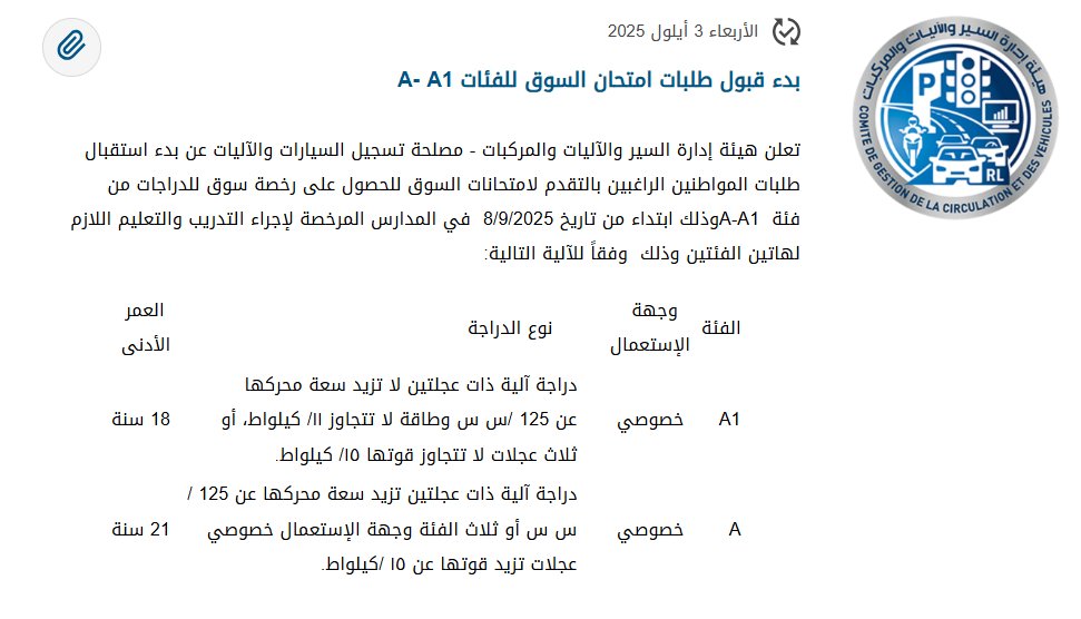 أعلنت وزارة الداخلية والبلديات- هيئة إدارة السير والآليات والمركبات على منصة "أكس"، بدء استقبال طلبات المواطنين الراغبين بالتقدم لامتحانات السوق للحصول على رخصة سوق للدراجات من فئة A-A1 وذلك ابتداء من تاريخ 8/9/2025 لمزيد من التفاصيل زوروا الرابط التالي: https://tmo.gov.lb/web/panel/announcements