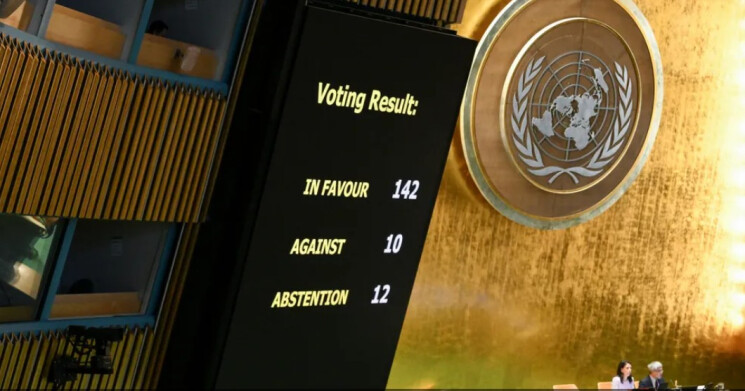 واعتمد الإعلان بأغلبية 142 صوتا، مقابل 10 أصوات ضده، بما في ذلك إسرائيل والولايات المتحدة، وامتناع 12 دولة عن التصويت.