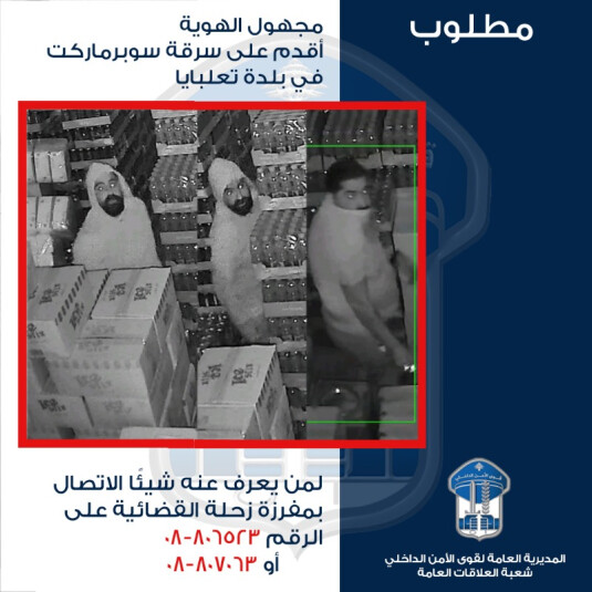 تُعمّم المديريّة العامّة لقوى الأمن الدّاخلي بناءً على إشارة القضاء المختصّ، صورة شخص مجهول الهويّة أقدم بتاريخ 02-06-2025 على الدّخول إلى سوبرماركت في بلدة تعلبايا، وسرق من داخلها أموالًا وبضائع قُدِّرت قيمتها بـ5،000 دولار أميركي.