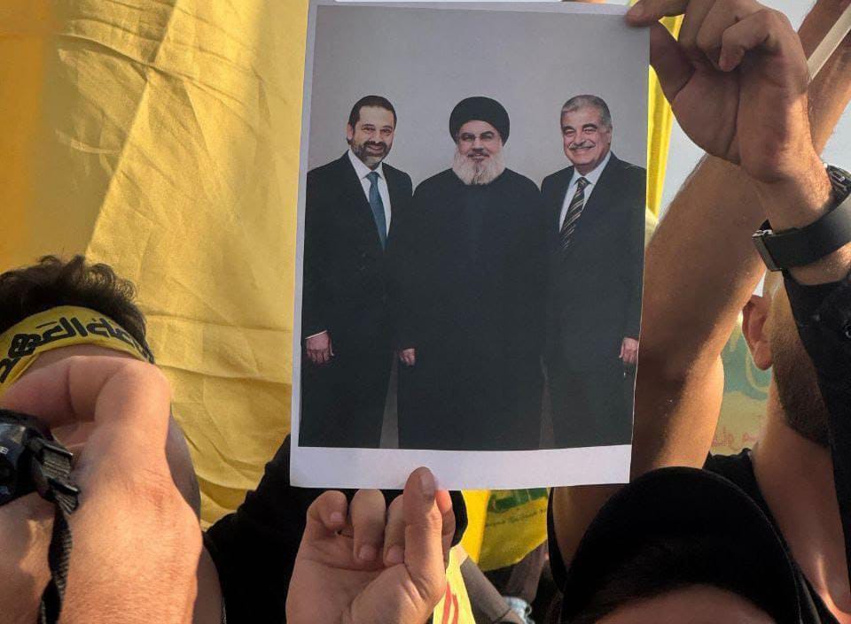 وحمل أحد المشاركين في التحرك صورة تضمّ أمين عام "حزب الله" السابق السيّد حسن نصرالله ورئيس الحكومة السّابق الشهيد رفيق الحريري ورئيس تيار "المستقبل" سعد الحريري.
