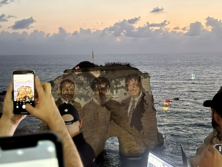 "حزب الله" يضيء صخرة الروشة بصورة نصرالله وصفي الدين