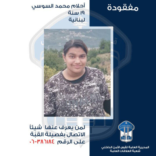 عمّمت المديريّة العامّة لقوى الأمن الدّاخلي بناءً على إشارة القضاء المختص، صورة المفقودة أحلام محمد السوسي (مواليد عام 2006، لبنانيّة)، التي غادرت حوالى الساعة 15،00 من تاريخ 24-11-2025 منزل جدّتها الكائن في القبة- شارع الجديد، إلى جهة مجهولة، ولم تَعُد لغاية تاريخه.