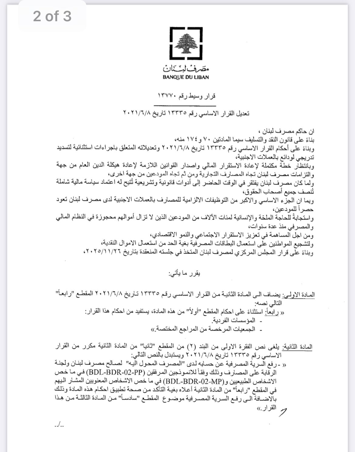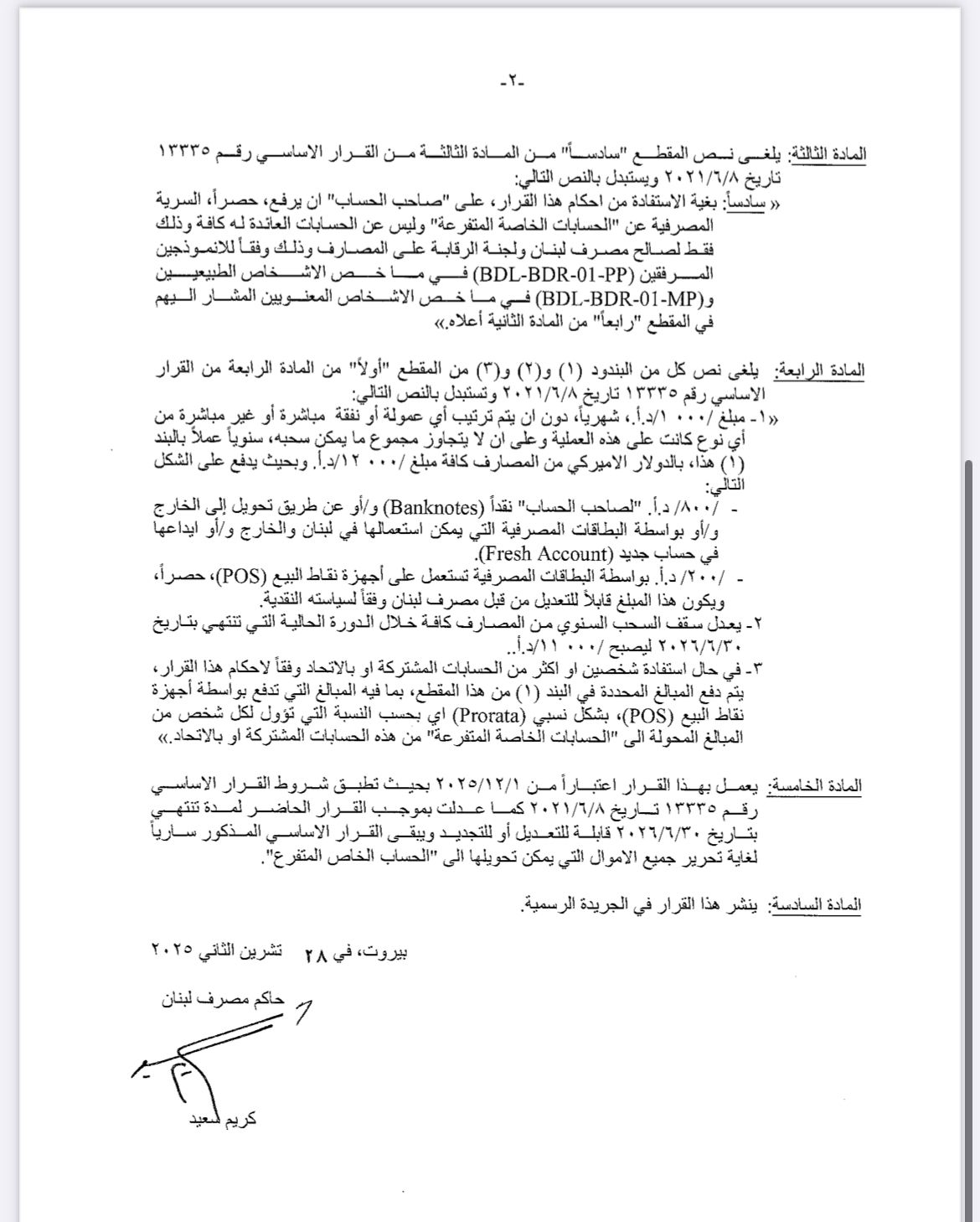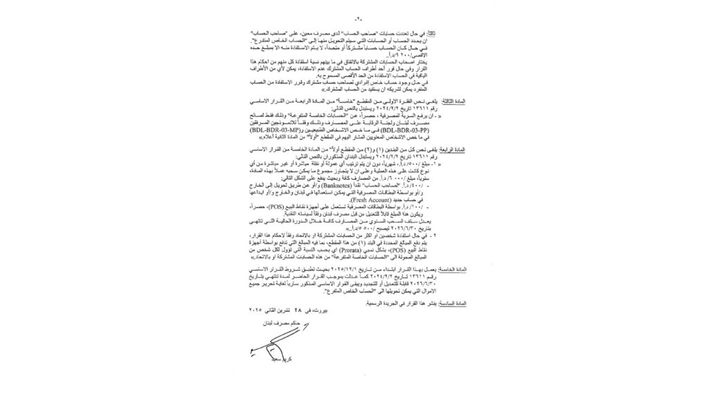 والثاني، يتعلق بتعديل القرار الأساسي رقم 13611 تاريخ 2/2/ 2024 ، يتعلق بإجراءات استثنائية لتسديد ودائع مكونة قبل تاريخ 30 - 6- 2023 بالعملات الأجنبية، المرفق بالتعميم الأساسي رقم 166.