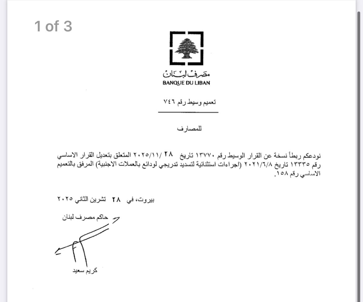صدر عن مصرف لبنان تعميمان وسيطان موجهان الى المصارف، وحملا الرقمين 746 و747، الأول يتعلق بتعديل القارا الأساسي رقم 13335 تاريخ 8/6/2021 ( اجراءات استثنائية لتسديد تدريجي لودائع بالعملات الأجنبية".