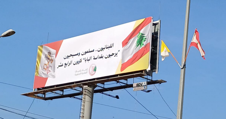 لافتة ترحيبية بالبابا من اتحاد بلديات الضاحية