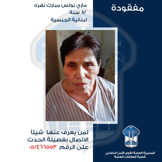 التي غادرت بتاريخ 19-12-2025 منزلها في الحدث، ولم تعد حتّى تاريخه. علمًا أنّها مصابة بمرض ألزهايمر.